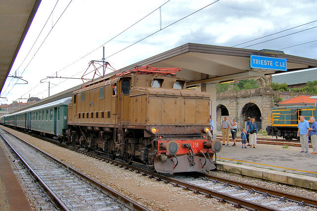 | In Villa Opicina übernahm die FS Museumslokomotive 728 022 unseren Zug und brachte uns mit - bremsprobenbedingter - Verspätung nach Trieste C.le. | |||